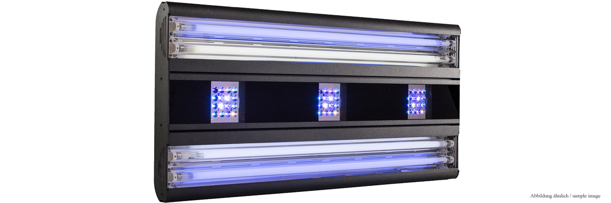 Die LED-Gruppen bieten drei getrennt voneinander programmierbare Farbkanäle mit jeweils bis zu acht Schaltpunkten pro Tag. Zusätzlich werden die beiden T5-Röhrenpaare wunschgemäß geschaltet. Die Lichtverteilung der T-5 Lampen so ausgelegt, dass sich das T-5 Licht mit dem Licht der LED Gruppen sinnvoll ergänzt.